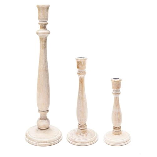Ensemble de 3 bougeoirsen bois clair effet poncé. Parfaits pour accueillir noslongues bougies RUSTIC, leur stylevintageapportera une touchechampêtre et naturelle sur votre table.